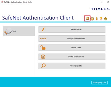2. Right-click and select Tools on that icon to open the Safenet Authentication Client. Click on the gear icon on the top right.