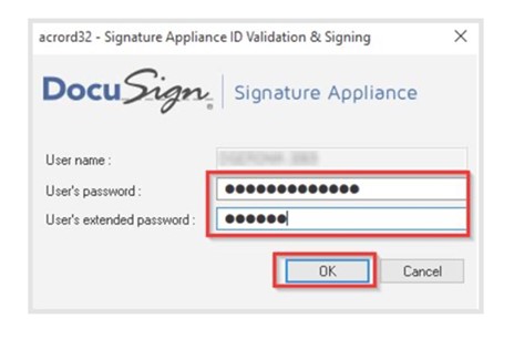 The DSA Client window will appear in which you enter the User name of your remote eSignature (form ABCDE-1234), User’s password and then click OK.