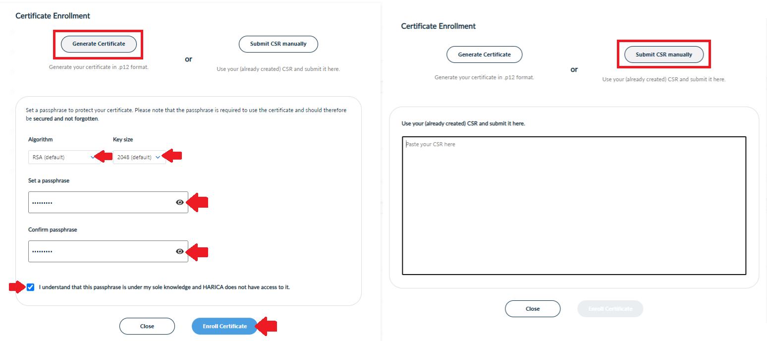 The Generate Certificate option requires you to select the key type/size and set a passphrase that you must remember since it will protect the private key of your certificate. Click Enroll Certificate.