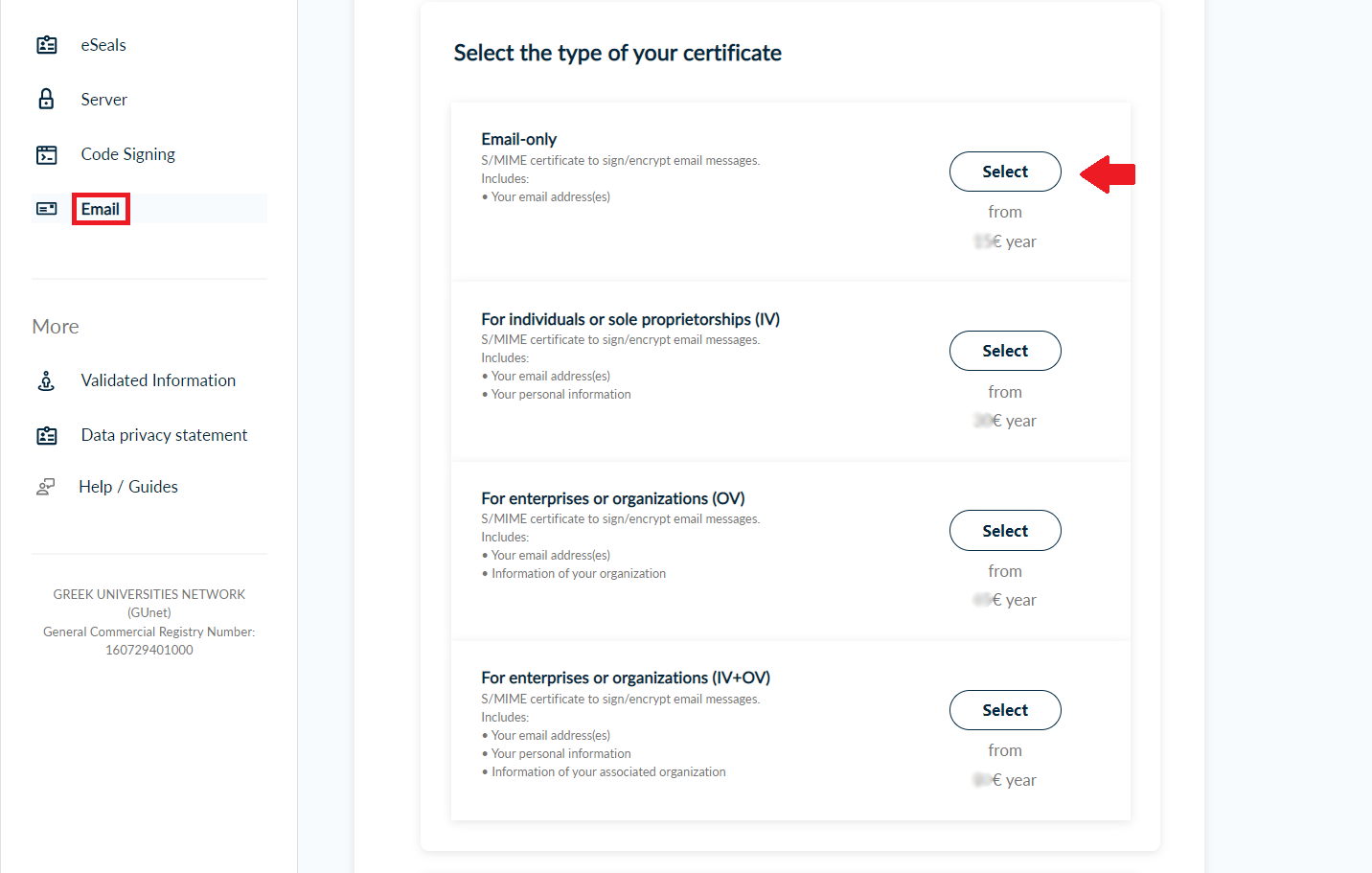 Once you log in, from the side bar, click Email and Select one of the following certificate types.