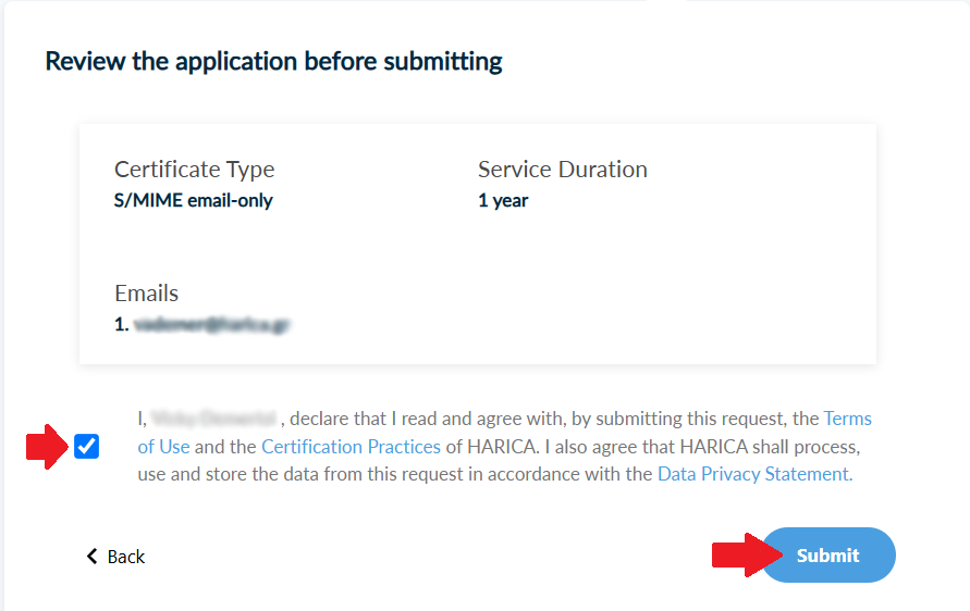 Check to make sure that all of the information is correct, accept the Terms of Use, the Certification Practices of HARICA and the Data Privacy Statement. Then, click Submit.