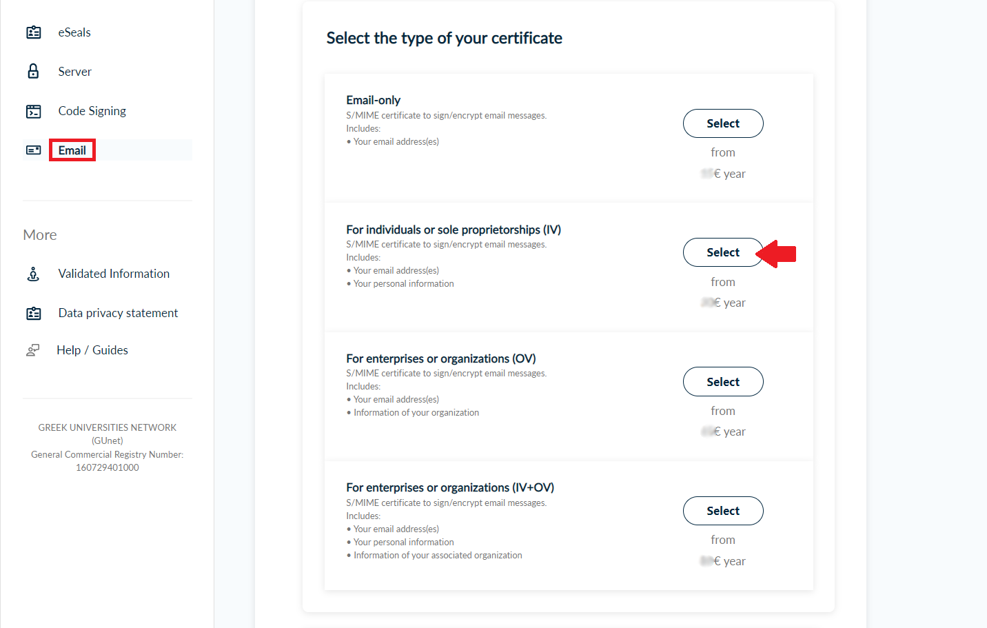 Once you log in, from the side bar, click Email and Select one of the following certificate types.