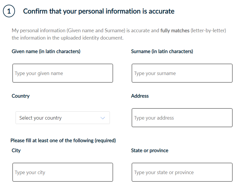 Make sure that your given name and surname are accurate and fully matched (letter-by-letter) with the information of the identification document in latin characters which you will upload next.
