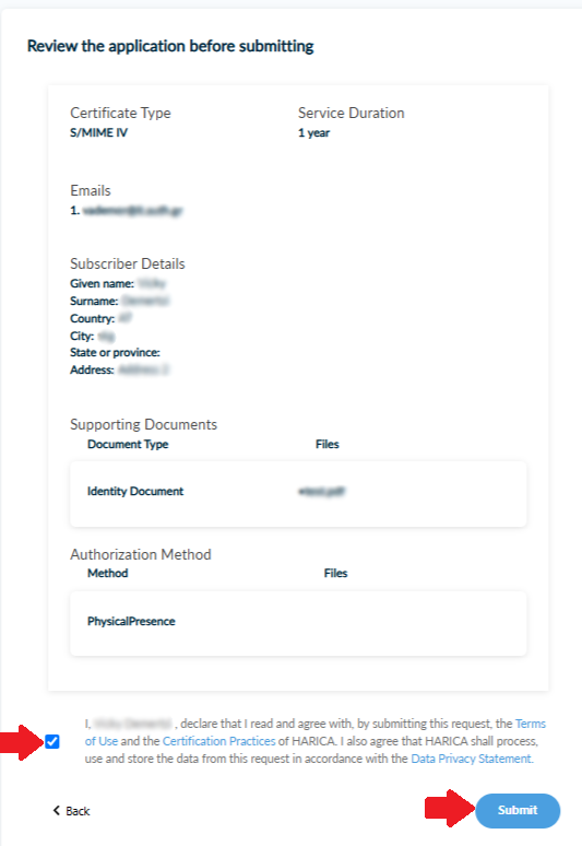 Check to make sure that all of the information is correct, accept the Terms of Use, the Certification Practices of HARICA and the Data Privacy Statement. Then, click Submit.
